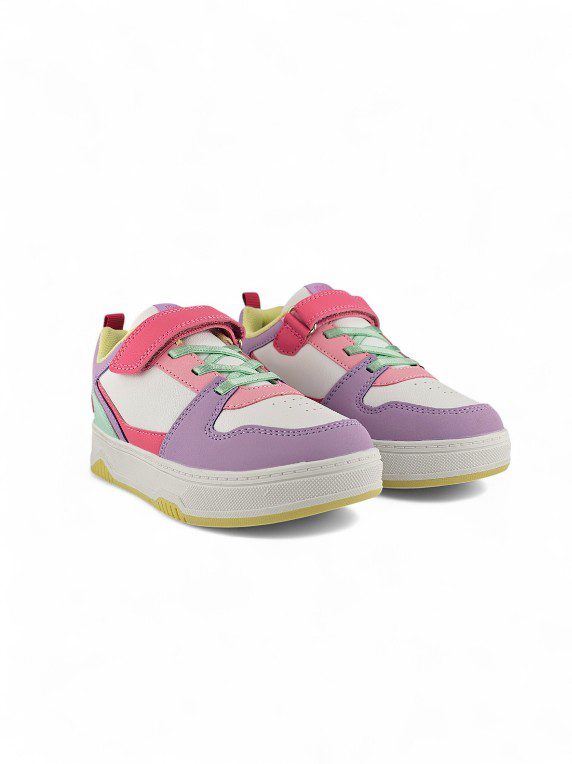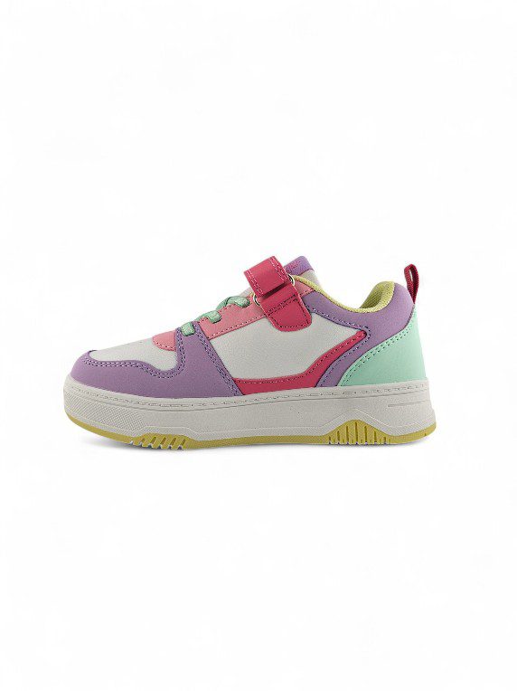 - Capellada en color blanco, en material sintético, con puntera color lila y talonera en color verde menta.